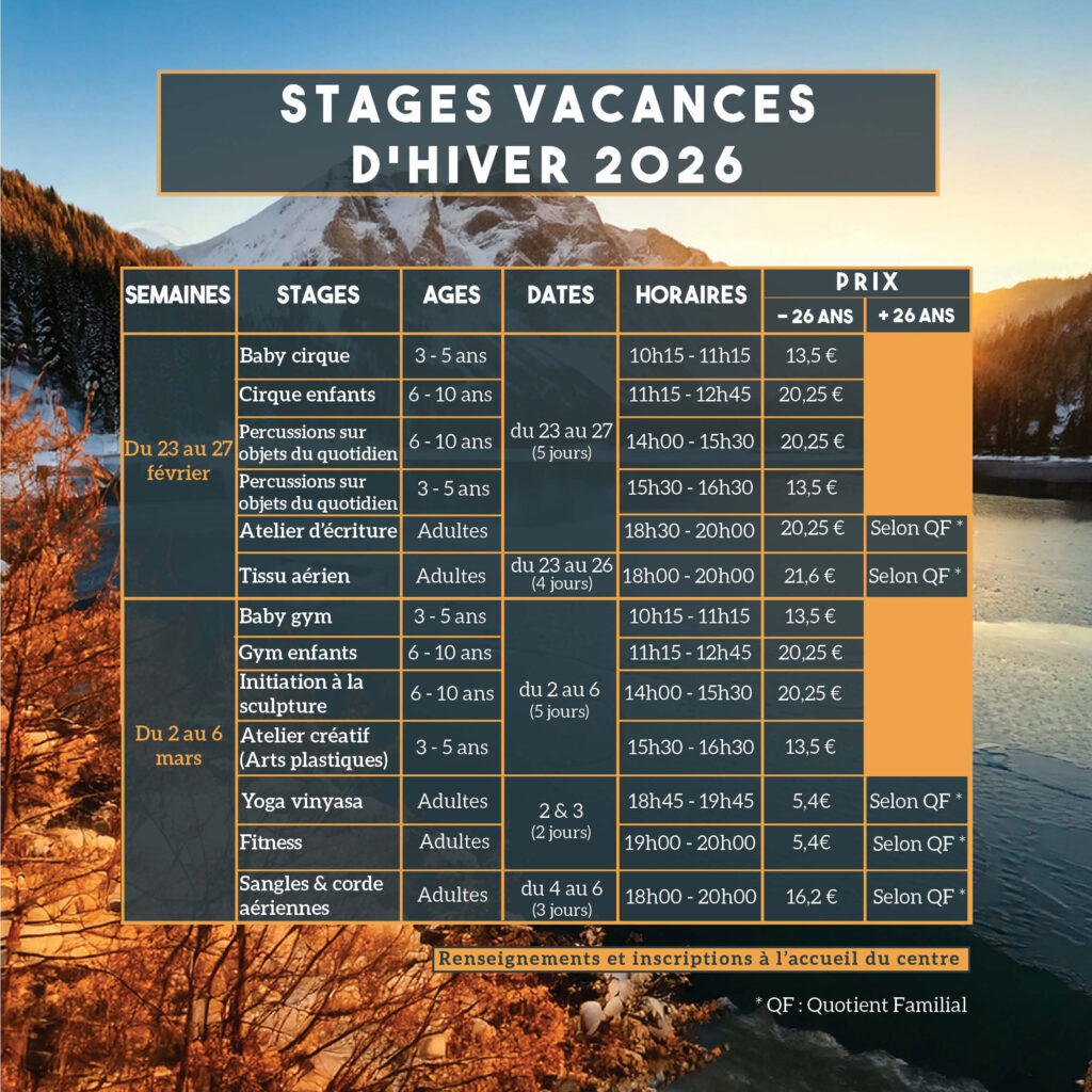 Les prix affichés sont valables pour toute la durée du stage, et pour les moins de 26 ans. Pour les plus de 26 ans, il sera calculé en fonction de votre quotient familial !